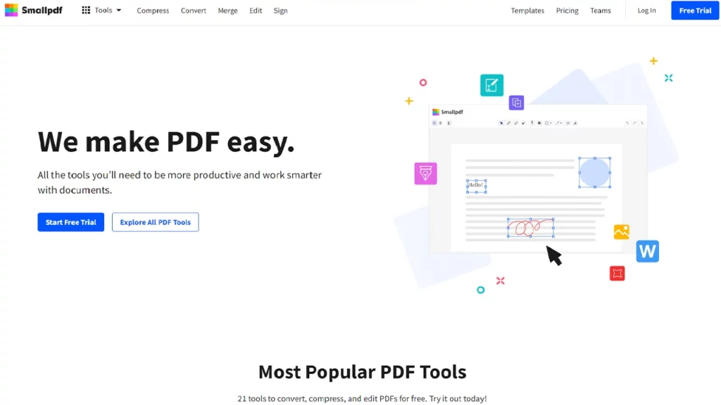 Smallpdf je bezplatná online platforma, která nabízí sadu jednoduchých, ale účinných nástrojů pro práci s PDF. Kromě pouhého prohlížení a úpravy poskytuje nástroje pro konverzi do a z různých formátů, kompresi a funkce elektronického podpisu. Díky cloudovému přístupu není potřeba žádná instalace softwaru, což umožňuje snadný přístup z jakéhokoli zařízení. Jeho intuitivní rozhraní zajišťuje, že i začátečníci mohou rychle zvládnout řadu úkolů souvisejících s PDF. Navíc, uživatelé mohou upgradovat za $9/měsíc.