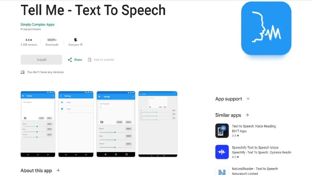 Der er også en gratis version af premium-muligheden tilgængelig i Google Play-butikken— Google Cloud tekst-til-tale. Funktionerne inkluderer muligheden for at skabe en tilpasset stemme, over 90 WaveNet-stemmer, tekst og SSML-understøttelse, og stemmetuning. Værktøjslinjen er nem at bruge, du kan syntetisere tale, der lyder som en menneskelig stemme, og det er et fantastisk høj-kvalitets værktøj til e-læring.