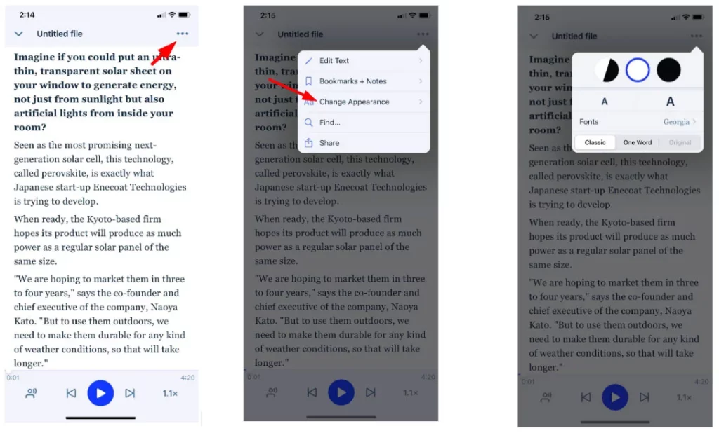 Wählen Sie ein Buch oder einen Artikel, den Sie lesen möchten, und tippen Sie oben rechts auf die drei Punkte. Dies sollte Ihnen mehrere Optionen öffnen. Tippen Sie auf „Erscheinungsbild ändern“.