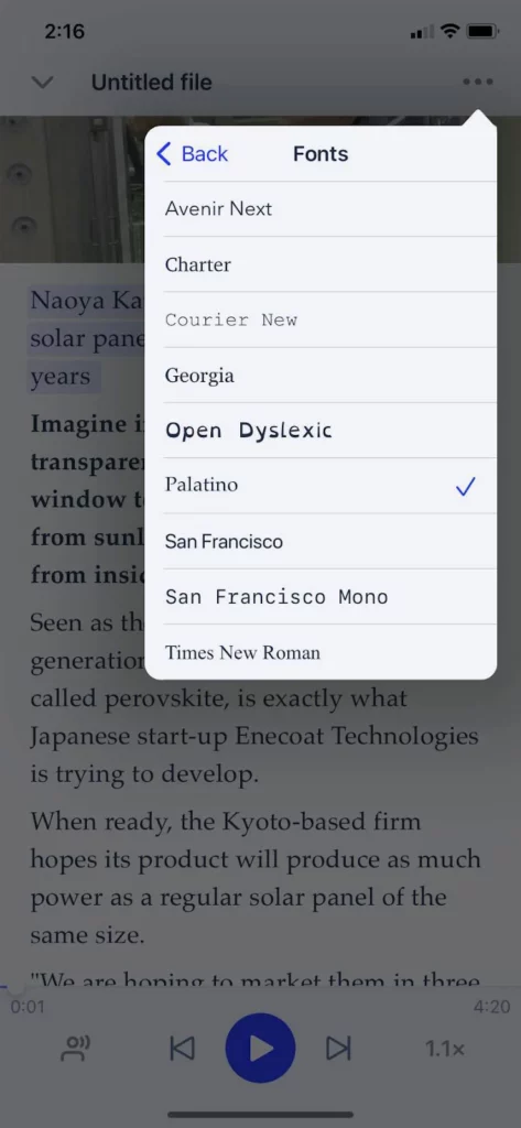Durch Tippen auf den Schriftartnamen erhalten Sie 9 verschiedene Optionen, aus denen Sie wählen können.