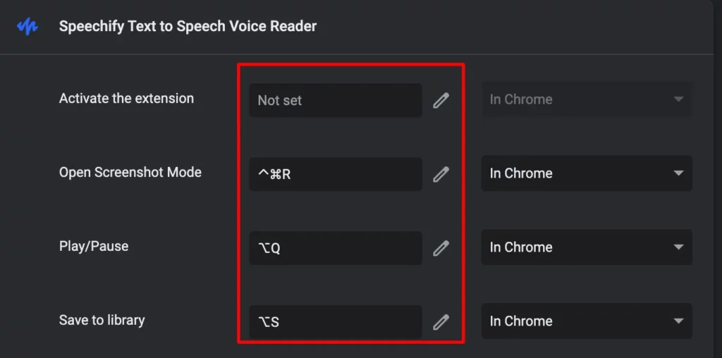 4. Scroll down to find Speechify for Chrome. You can change the shortcut keys from there.