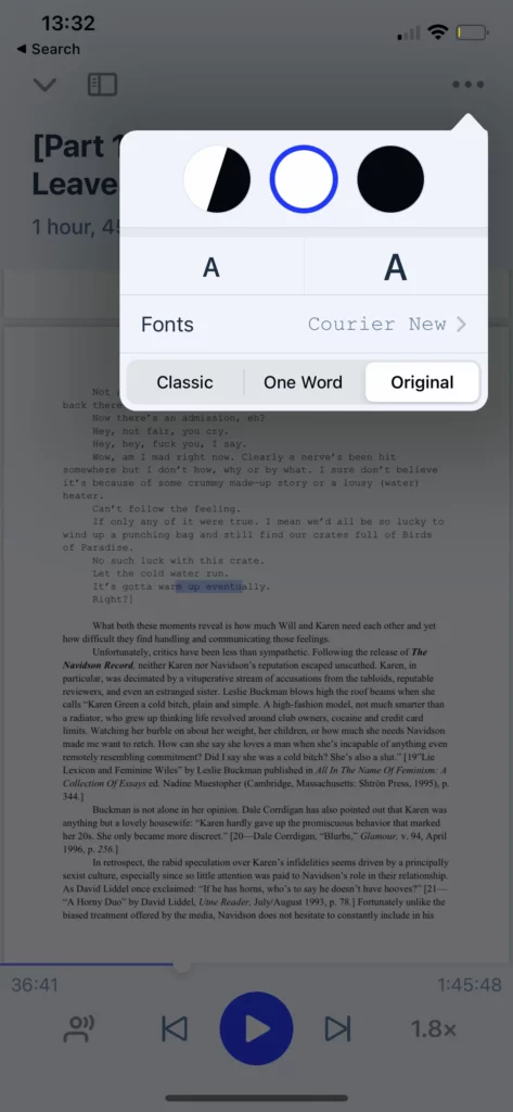 • 클래식 모드는 선택한 배경, 글꼴 크기 및 글꼴 유형으로 전체 기사를 표시합니다.