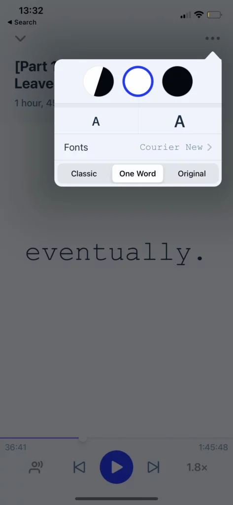 • 한 단어 모드는 선택한 배경, 글꼴 크기 및 글꼴 유형으로 한 번에 한 단어씩 화면에 표시합니다.