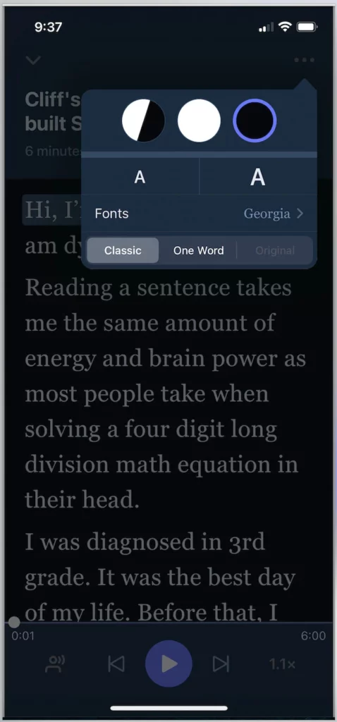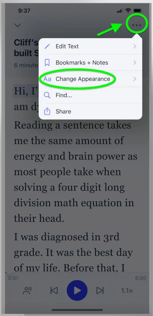 Escolha um livro/artigo que deseja ler e, no canto superior direito, toque no ícone de “kebab” (3 pontos) ícone e então, toque em 'Aa Mudar Aparência'. Isso deve abrir várias opções para você.