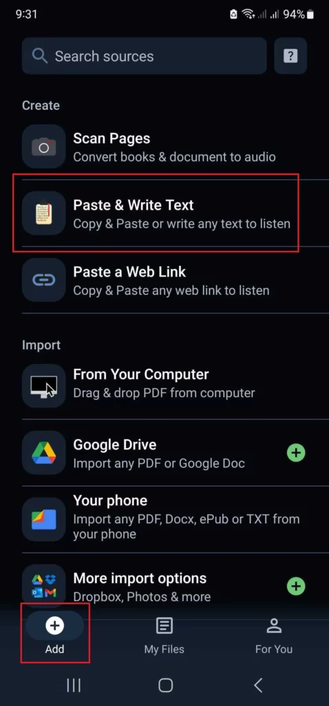 - Öppna Speechify och tryck på + ikonen eller Lägg till