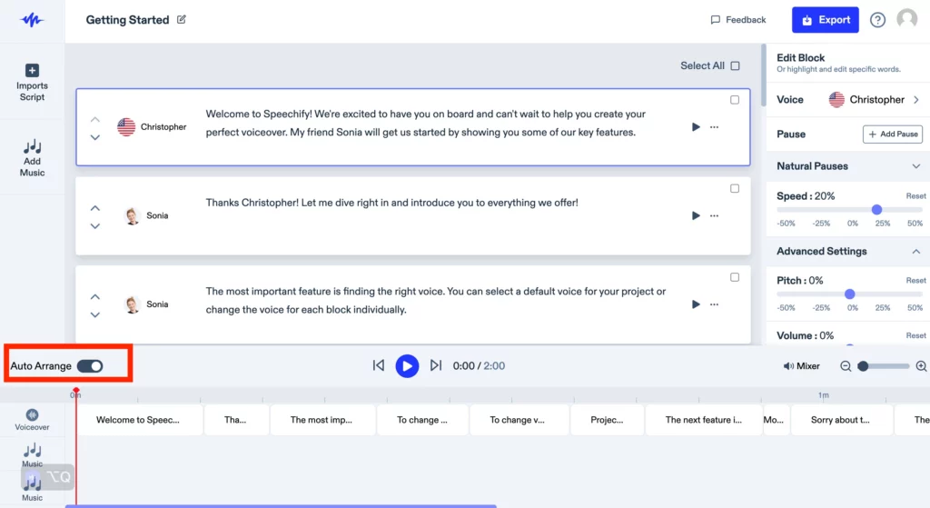 7. 启用时,您也可以通过沿时间线拖动音频片段来覆盖自动排列功能。