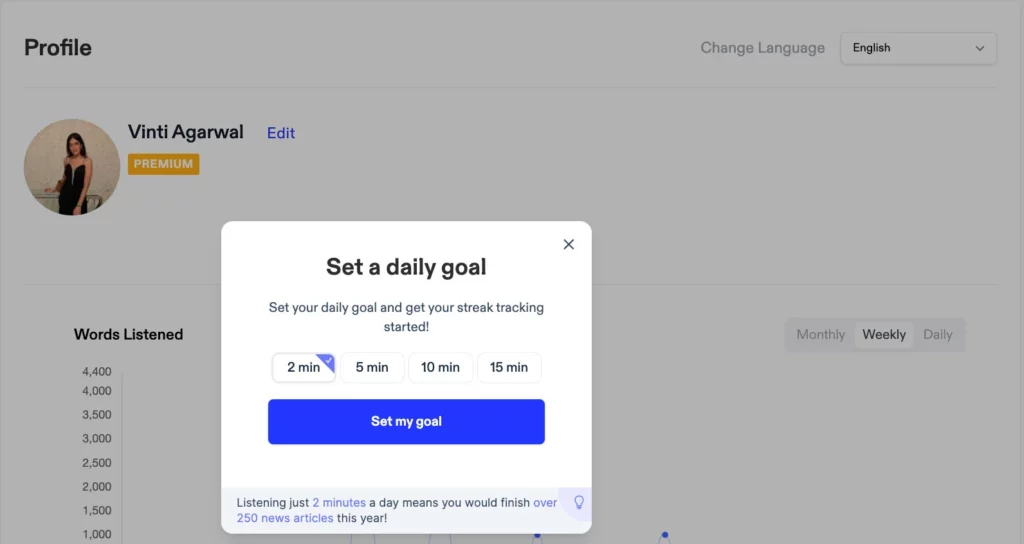 現在,您可以使用 Speechify 網頁應用程式在電腦、桌面或 PC 上設定每日聆聽目標