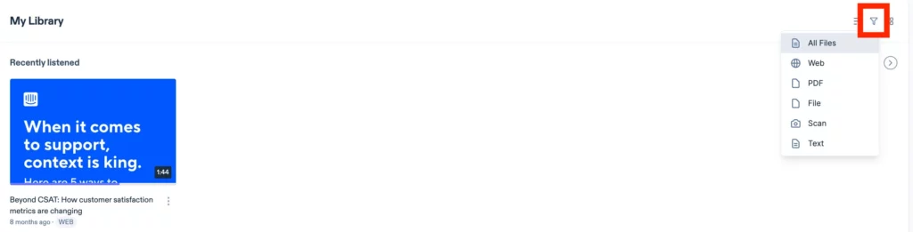 - Voit suodattaa Speechify-kirjastosi nähdäksesi vain tietyn muotoiset tiedostot, kuten verkkolinkit, PDF:t, skannaukset ja tekstitiedostot, käyttämällä suppiloikonia oikeassa yläkulmassa.