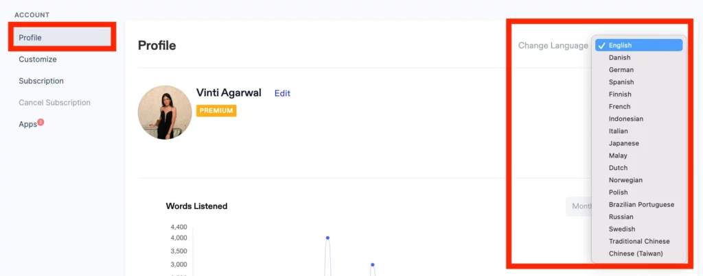 您可以在PC、台式机和笔记本电脑上更改Speechify应用的语言,并从18种不同语言中进行选择