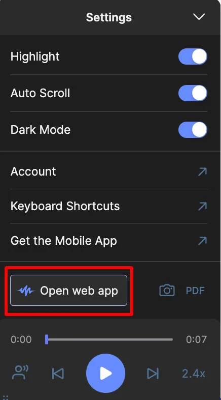 另一种访问图书馆的方法是通过Speechify播放器,点击设置或小工具中的齿轮图标⚙️。选择打开网络应用,它将引导您找到'我的图书馆'。