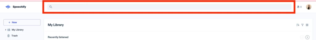 - 首頁即為您的 Speechify 資料庫,螢幕上方有一個搜尋欄,您可以用來搜尋 Speechify 資料庫中的任何檔案。